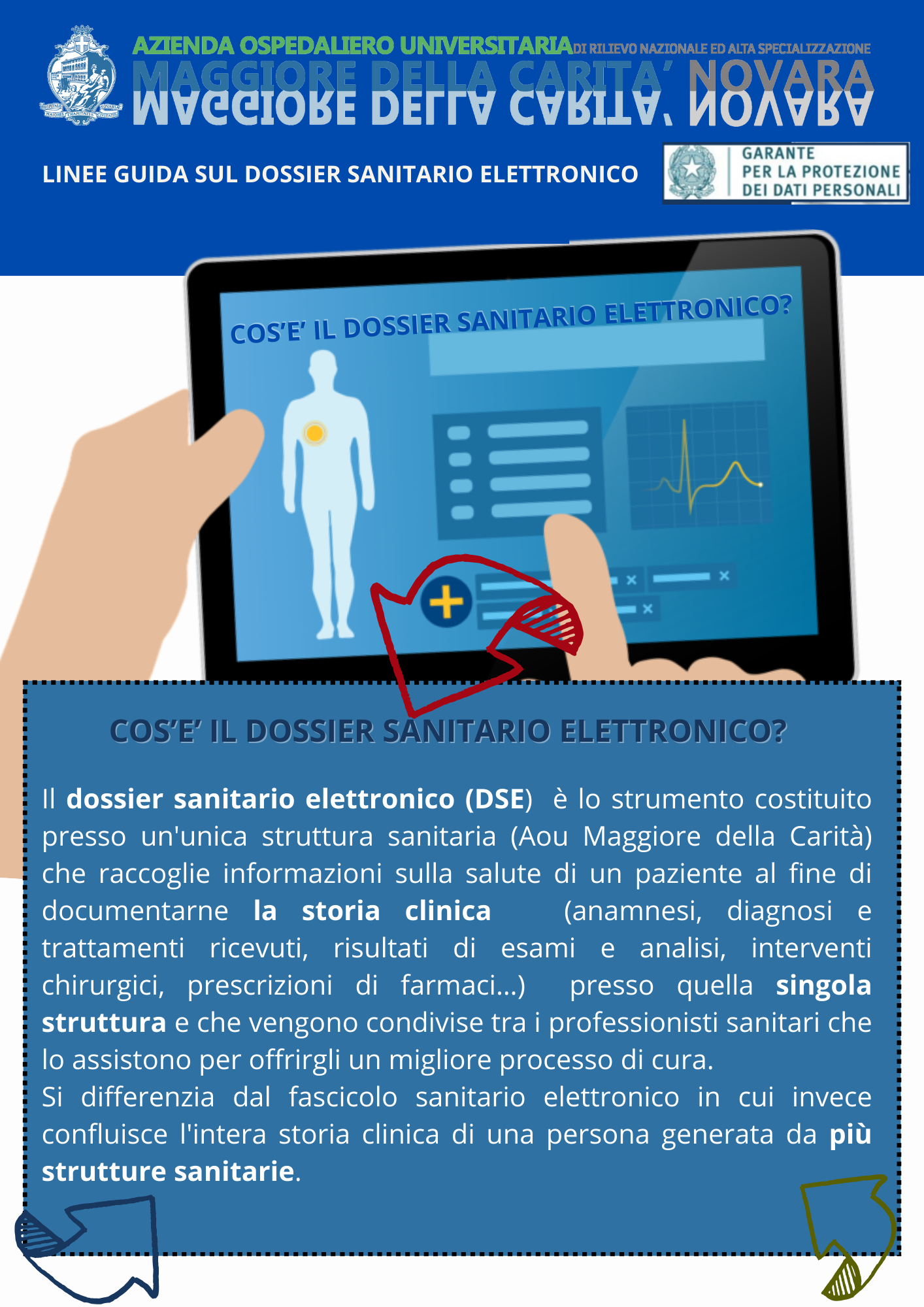 A partire dal 15 aprile 2025, agli utenti che si recheranno presso alcuni sportelli dell’Azienda ospedaliero-universitaria Maggiore della Carità di Novara sarà chiesto di firmare un modulo per autorizzare l’uso e la condivisione sicura delle proprie informazioni sanitarie all’interno della struttura (Dossier Sanitario Elettronico DSE).